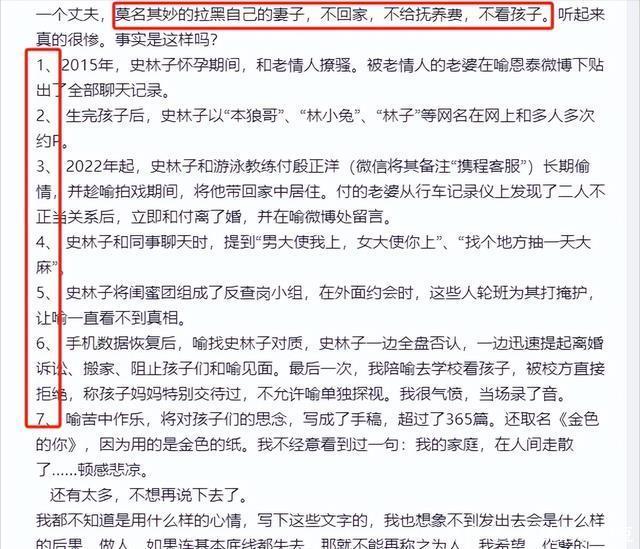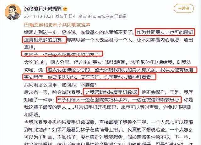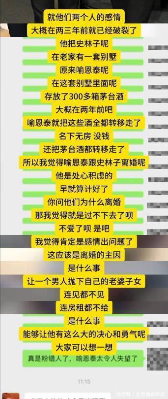 11月18日,一位自称是喻恩泰和史林子共同好友的人曝料,本以为他是劝和的,结果他把夫妻最后的体面给撕扯下来了。 开篇他就表示史女士已经不配做他的朋友了,之后就表示两人分居后,女方找过他做当事人来调解两人的关系。